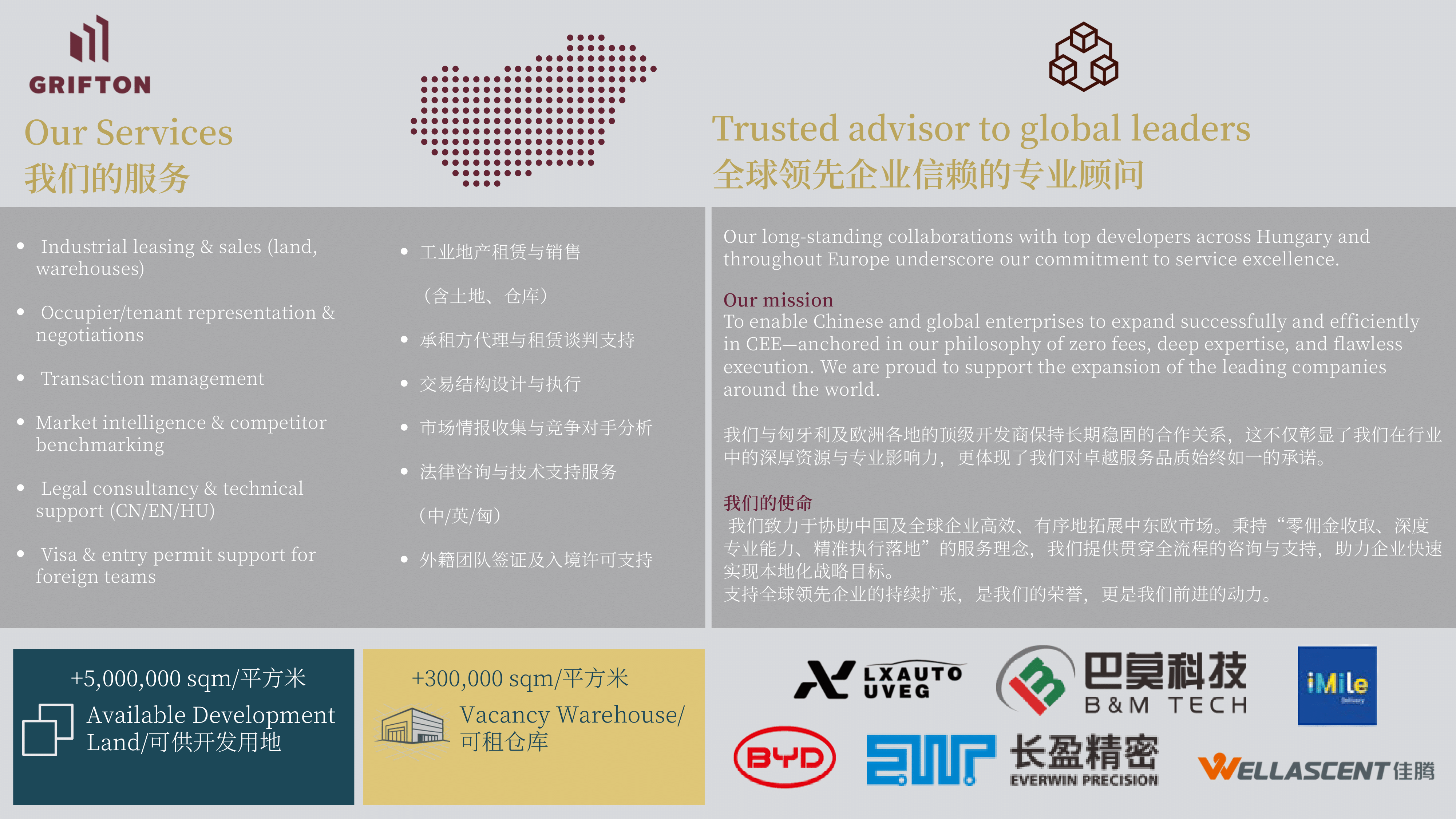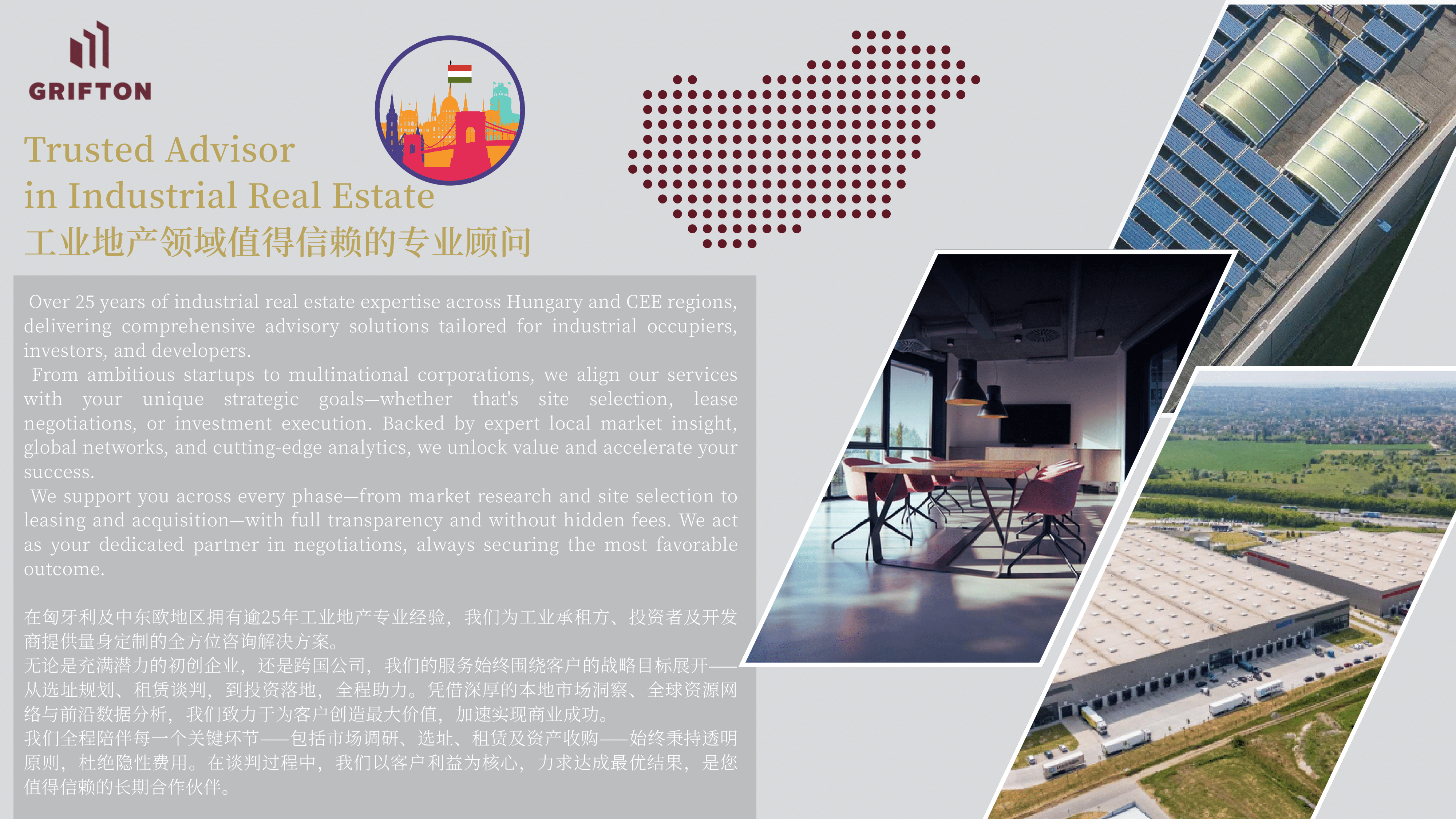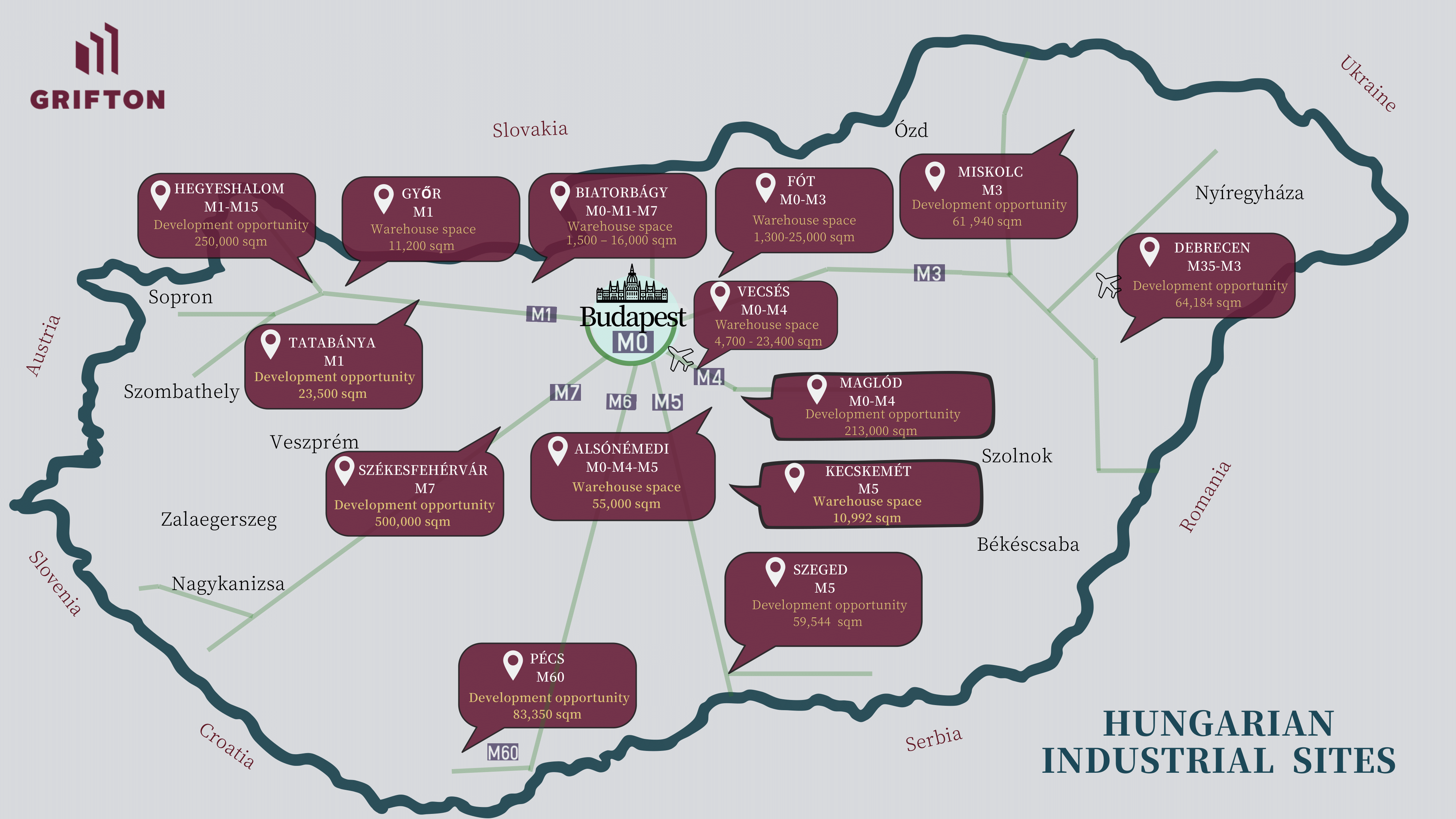 A Grifton Property Kft. magasan képzett szakemberei közel 20 évnyi együttes ipari ingatlan területen szerzett tapasztalattal és hozzáértéssel rendelkeznek legyen az fejlesztési telek, telephely, raktár vagy gyártócsarnok, logisztikai ingatlan. A munkatársaink együttesen több mint 850 000 m2 telket értékesített, és több mint 320 000 m2 raktárt és ipari ingatlant értékesített illetve adott bérbe. Ingatlanajánlatai között szerepel ipari terület, valamint újépítésű illetve már megépült raktár, gyártó- illetve logisztikai csarnok eladásra és bérletre egyaránt.